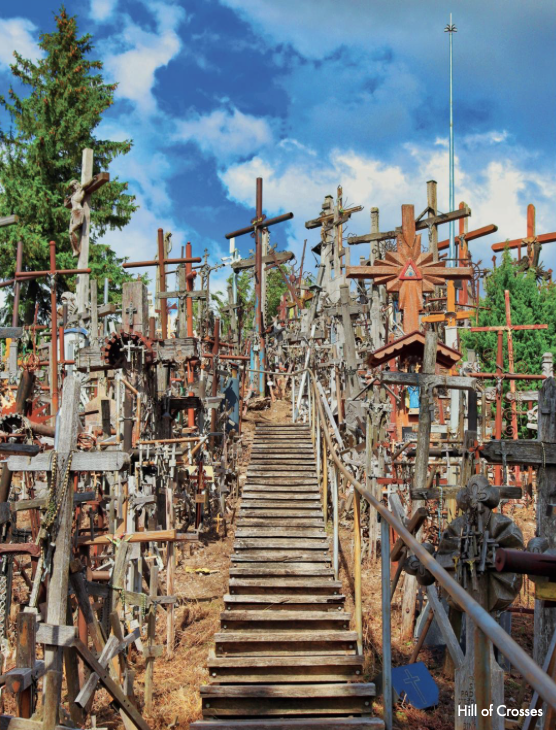 Another day, Andrius surprised us with a visit to the Hill of Crosses, a sacred site in northern Lithuania. On this knoll, thousands of crosses are densely packed on a hill, some almost toppling over each other — many with rosary beads and crucifixes looped overlap — placed there as memorials, as symbols of hope, or as symbols of gratitude or requests made to God.